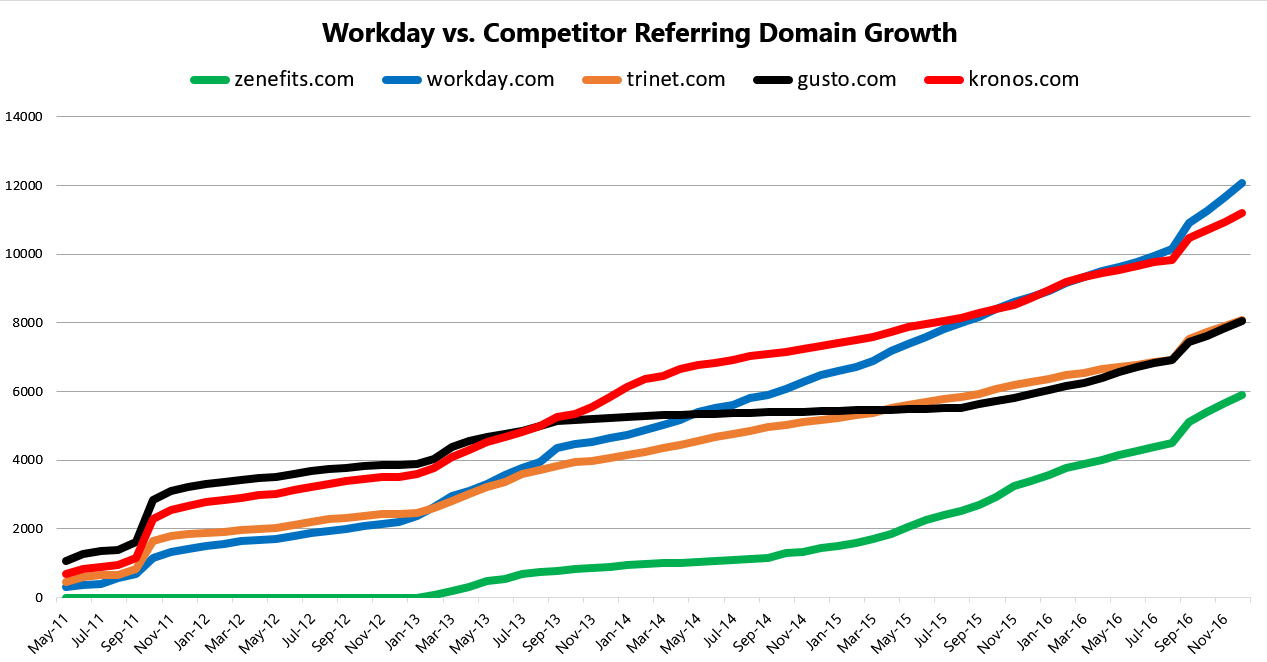 - Referring Domain Velocity: Workday and Kronos have been fighting it out for the top spot since 2014. Workday has since taken a slight edge, building more links from more referring domains over time than key competitors. On average, they earn links from approximately 2,000 referring domains per month. That level of referring domain growth has been instrumental to their organic search success.